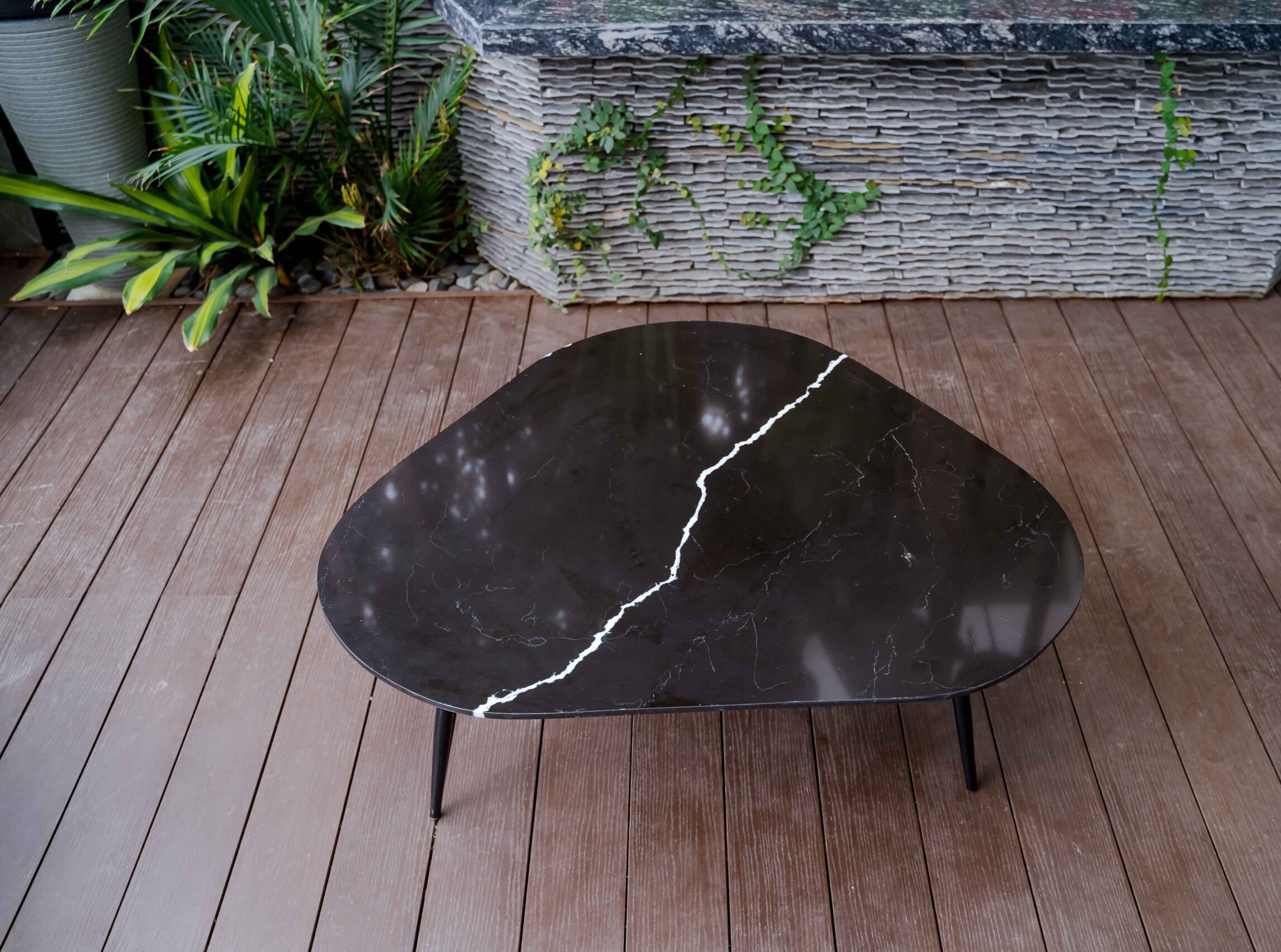 Bàn hình tam giác cân, cạnh 900mm, cao 450mm. Khung chân inox, mặt đá Vicostone nhóm D.