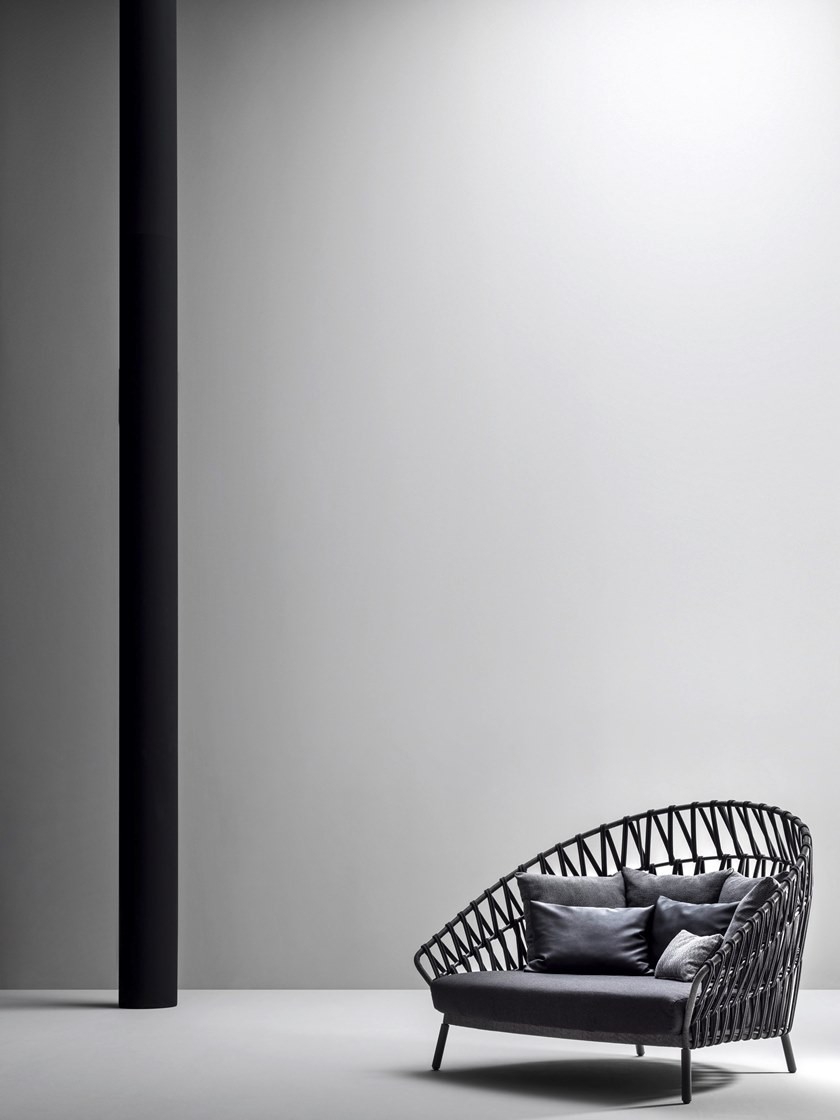 Chất liệu: Khung inox sơn tĩnh điện, nệm gối bọc vải ngoài trời, mousse D40, đan dây dù.
