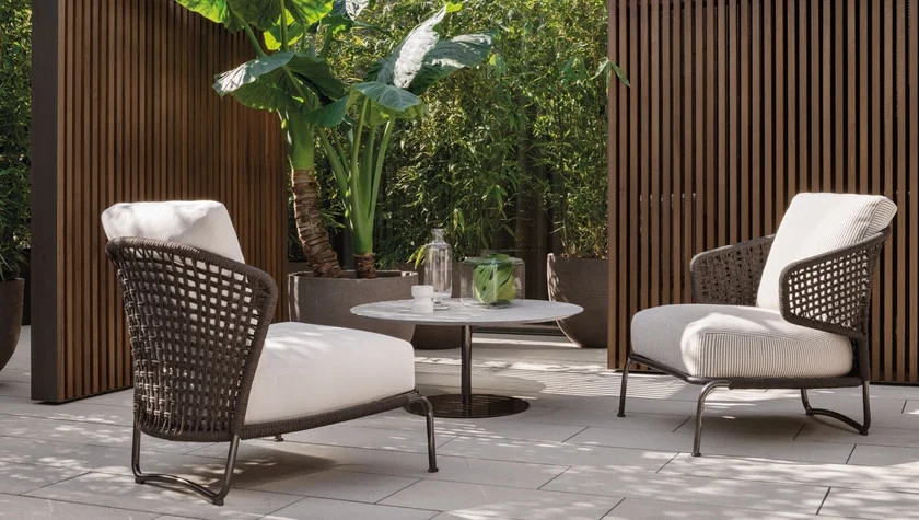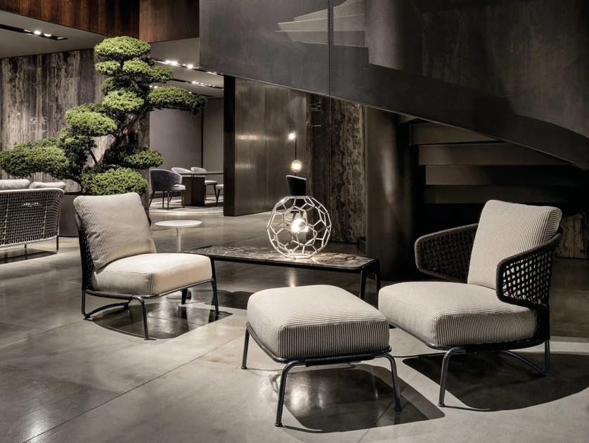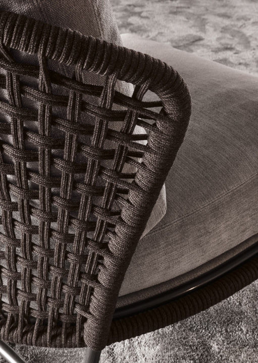 Chất liệu sản phẩm: khung inox sơn tĩnh điện, đan dây dù, nệm mousse D40 bọc vải Cỏ May.